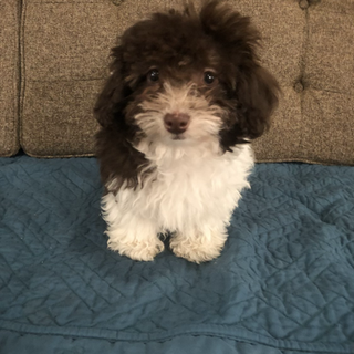 Lola…she is a show stopping ball of fluff and energy! She is the cutest combination of spunk and cuddliness that you will ever see. Currently she weighs a total of 3.5 pounds and is expected to be 5-6 pounds full grown. Her coat color is chocolate and white parti. She comes with a one year genetic health guarantee and AKC registration. Lola is not shy and will quickly wiggle her way into your heart with her tiny kisses. She is now available for pick up in Colorado Springs.